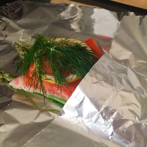 - Take some tin foil and cut it into squares large enough to wrap the salmon. Lay down your bed of 6-8 asparagus spears in the centre of each one.